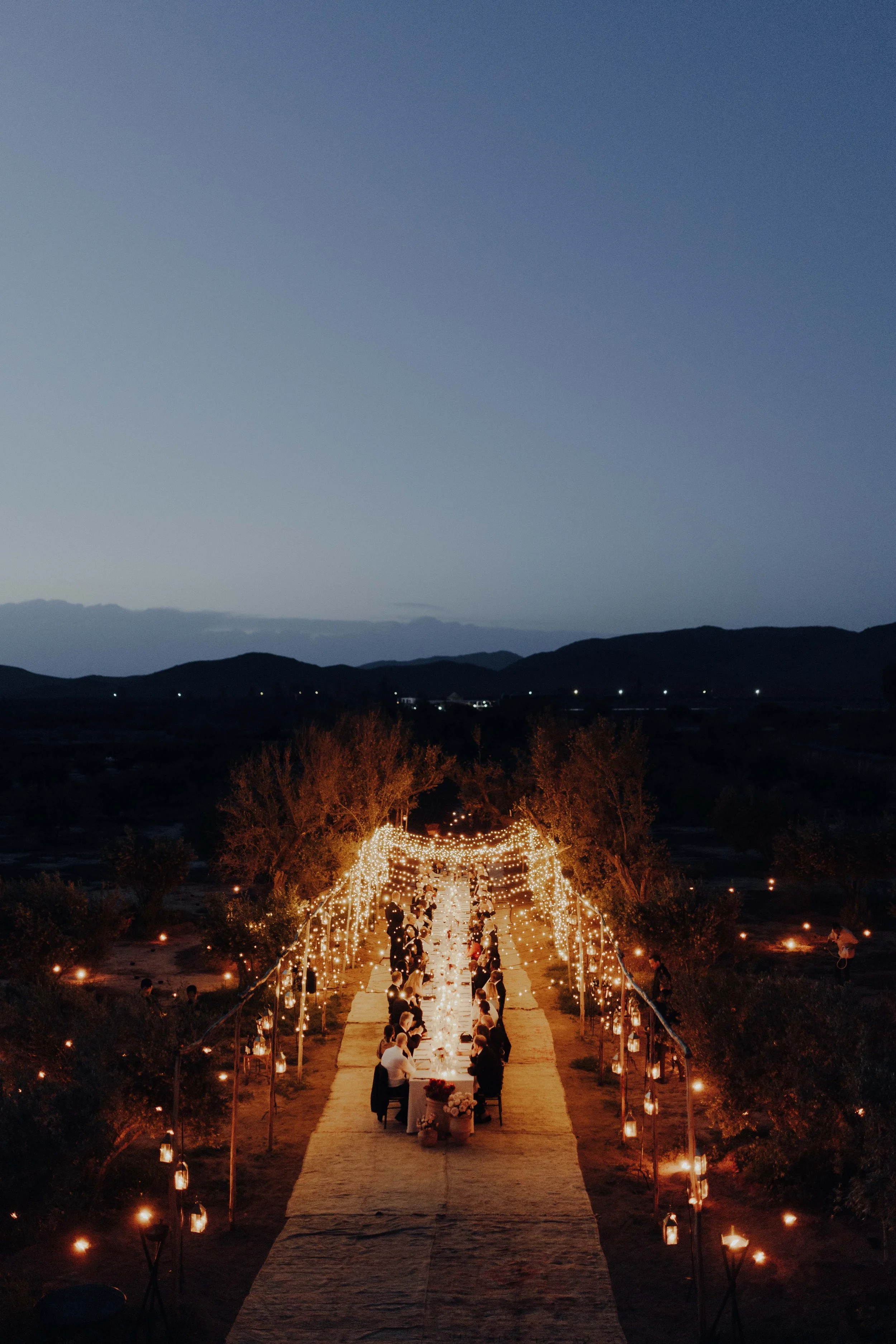 We suggest arriving before sunset to visit the farm and enjoy a rooftop aperitif with canapés before dining under our two hundred year old olive trees and garland lighting.